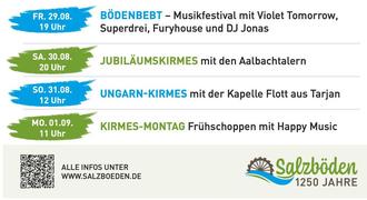 Wir freuen uns im Rahmen unserer 1250-Jahre-Salzböden-Feierlichkeiten die folgenden Veranstaltungen am 1. Festwochenende (22.08.-24.08.2025) präsentieren zu können: