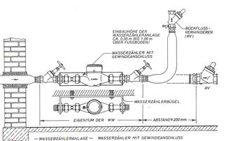 Im Zusammenhang mit dem Austausch der Wasserzähler weisen wir darauf hin, dass entsprechend den gültigen DIN-Vorschriften jede private Trinkwasseranlage, die an eine zentrale Wasserversorgungsanlage angeschlossen ist, unmittelbar hinter dem Wasserzähler einen Rückflussverhinderer haben muss, damit ein Rückfließen aus der Trinkwasseranlage in die zentrale Wasserversorgungsanlage ausgeschlossen ist. Das Schema einer korrekten Wasserzähleranlage nach DIN 1988 ist nachfolgend abgebildet: