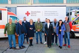 (v. l.) Hryhorii Tkachenko (Mitglied des Gebietsrats von Tschernihiw), Niko Gerth (DRK), Serhii Harus (Vorsitzender des Gemeinderats von Ripkyne), Thomas Hose (DRK), Landrätin Anita Schneider, Christian Betz (Vorstandsvorsitzender DRK Kreisverband Marburg-Gießen), Alexander Mack (DRK Vorstand), Tetiana Kuznetsova (Leiterin des Bezirksrats von Tschernihiw), Udo Liebich (Büroleiter der Landrätin), Lesja Maltseva (Leiterin Angelegenheiten der Exekutive des Bezirksrats von Tschernihiw) und Marco Schulte-Lünzum (Regionalvorstand JUH Regionalverband Mittelhessen).