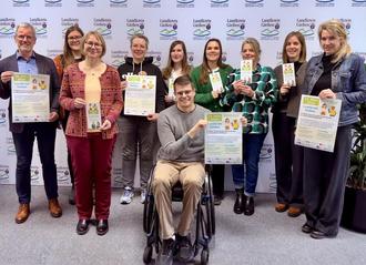 Informieren zum Internationalen Tag der Menschen mit Behinderungen über den DUOday im Landkreis Gießen (v. l.): Sozialdezernent Frank Ide, Katharina Steinfeld (Integrationsfachdienst Gießen/Wetzlar), Mirjam Aasman (Jugendwerkstatt Gießen), Annika Heuser (ZAUG), Samantha Fischer (IHK Gießen-Friedberg), Michael Volter (Landkreis Gießen), Jenny Truhöl (Handwerkskammer Wiesbaden), Petra Emin (Lebenshilfe Gießen), Larissa Albohn (EAA) und Katharina Neu (Jugendwerkstatt Gießen).