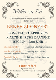 Am Sonntag, dem 13. April 2025, findet in der Martinskirche in Dautphe ein Konzert statt, das auf Initiative des Männerchores „Amici del Canto“ als Benefizkonzert für den Lebenshilfe Ortsverein Biedenkopf gestaltet wird. Das Konzert beginnt um 17,oo Uhr. Ausführende sind neben den „Amici del Canto“ die Sängerinnen des Frauenchores „Vocalis Wittgenstein“ und ein Blechbläserensemble.
