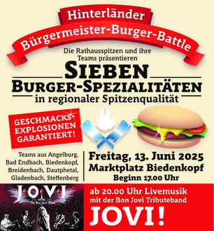 Am Freitag, den 13. Juni 2025, verwandelt sich der Marktplatz in Biedenkopf ab 17:00 Uhr in eine Arena des guten Geschmacks. Beim 3. Hinterländer Bürgermeister-Burger-Battle treten die Bürgermeister der Region in einem spannenden Grillwettbewerb gegeneinander an – und Steffenberg ist bereit, den Titel zu holen!