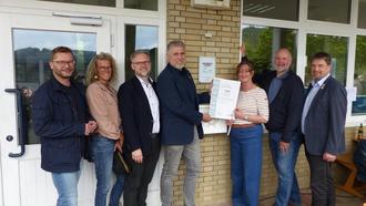 Breidenbach-Wolzhausen - Bundesweite VDN-Auszeichnung für umweltpädagogisches Schulkonzept Breidenbach- Wolzhausen, 24.05.2024. Eine neue Plakette wird ab sofort den Eingangsbereich der Grundschule Wolzhausen schmücken, denn die Schule darf sich ab jetzt „Naturpark-Schule“ nennen. Sie ist die achte Naturpark-Schule im Naturpark Lahn-Dill-Bergland, die zweite im Kreis Marburg Biedenkopf, die dieses bundesweite Zertifikat vom Verband Deutscher Naturparke (VDN) erhält. Die Urkunde und die Plakette wurden am Freitag im Rahmen einer Feierstunde von Marco Herrmann (Vorsitzender Naturpark Lahn-Dill-Bergland), Jens Womelsdorf (Landrat Kreis Marburg-Biedenkopf) und Dr. Jörg Wegerhoff (Bildungsbeauftragter Naturpark Lahn-Dill-Bergland) an die Schulleiterin der Grundschule Wolzhausen Manuela Boms überreicht. Herzlich gratulierte auch der Bürgermeister Herr Wege der Gemeinde Steffenberg, der Bürgermeister Herr Felkl der Gemeinde Breidenbach sowie die Ortsvorsteherin von Wolzhausen Julia Meier.
