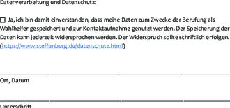 Haben wir Ihr Interesse geweckt und möchten Sie die Gemeinde Steffenberg als Wahlhelfer unterstützen? Dann füllen Sie bitte das beigefügte Anmeldeformular aus, unterschreiben dies und senden es uns möglichst zeitnah zurück. Gerne auch per Mail an gemeindeverwaltung@steffenberg.de.