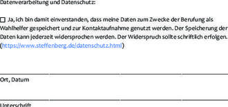 Haben wir Ihr Interesse geweckt und möchten Sie die Gemeinde Steffenberg als Wahlhelfer unterstützen? Dann füllen Sie bitte das beigefügte Anmeldeformular aus, unterschreiben dies und senden es uns möglichst zeitnah zurück. Gerne auch per Mail an gemeindeverwaltung@steffenberg.de.