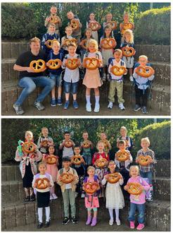 Nach der 1. Unterrichsstunde bekamen die Erstklasskinder von Frau Plaum (Löwenklasse), Herrn Achenbach (Piratenklasse 1b) und Frau Theiß (Dinoklasse 1a) eine Brezel, die der Bürgermeister Gernot Wege gestiftet hatte.