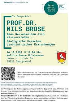 Am 16. Oktober 2025 um 19:00 Uhr spricht der Biochemiker Nils Brose in der Kulturscheune Holzhausen über biologische Ursachen psychiatrischer Erkrankungen. Er spricht mit den Gästen über die Chancen und Grenzen einer biologischen Perspektive auf diese Erkrankungen und gibt Einblicke in das Leben eines Wissenschaftlers.