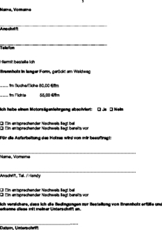 Jede(r) Besteller(in) erkennt mit Abgabe ihrer/seiner Bestellung die vorgenannten Bedingungen des gemeindlichen Brennholzverkaufs uneingeschränkt an.