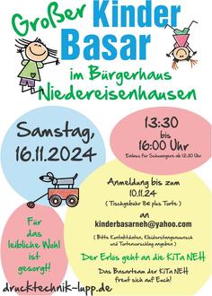Das Basarteam der KiTa Niedereisenhausen veranstaltet am Samstag, den 16. November 2024 von 13:30 - 16:00 Uhr den nächsten Kinderbasar. Auf über 70 Tischen kann alles „Rund um’s Kind“ zum Verkauf angeboten werden, wie üblich steht auch der Groß-Teile-Raum wieder zur Verfügung und für Euer leibliches Wohl ist gesorgt.