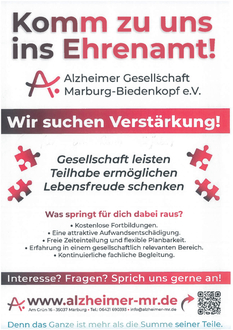 Ist das Interesse geweckt? Weitere Informationen erhalten sie dazu entweder direkt bei der Alzheimer Gesellschaft 06421/690393 oder m.fruehwein@alzheimer-mr.de, oder wenden sie sich an die Gemeindepflege Steffenberg 0151/21608009, sowie bei Frau Alexandra Michel, 06464 9188 10 alexandra.michel@steffenberg.de.