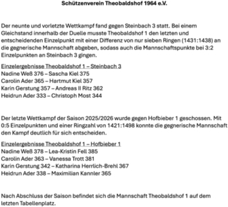 Der letzte Wettkampf der Saison 2025/2026 wurde gegen Hofbieber 1 geschossen. Mit 0:5 Einzelpunkten und einer Ringzahl von 1421:1498 konnte die gegnerische Mannschaft den Kampf deutlich für sich entscheiden.