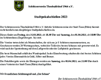 Der Schützenverein Theobaldshof 1964 e.V. lädt die Schützenvereine der Stadt Tann (Rhön) hiermit recht herzlich zum diesjährigen Stadtpokalschießen ein.
