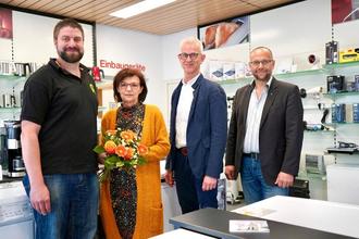 Die Leiterin für das Elektrofachgeschäft in Hilders, Edith Schmitt, wurde feierlich verabschiedet. V.l. Jochen Endres (stellv. Betriebsratsvorsitzender), Edith Schmitt, Joachim Schärtl (Geschäftsführer), Ingo Habig (Leiter Bezirksstelle in Hilders). Foto: Susan Damm, ÜW Rhön