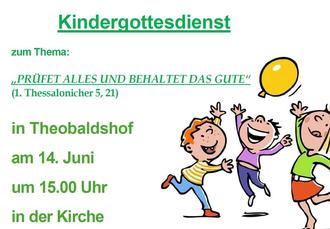 Der Kindergottesdienst am 14. Juni steht diesmal unter der Überschrift „Prüfet alles und behaltet das Gute“. Er beginnt um 15.00 Uhr in der Kirche Theobaldshof. Selbstverständlich sind auch alle Kinder eingeladen, die nicht in Theobaldshof wohnen. Das Kigo-team freut sich auf euch.
