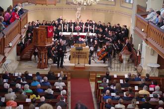 Musikalischer und auch emotionaler Höhepunkt des Abends aber war zweifelsohne die Uraufführung der Kantate über Psalm 121 „Ich hebe meine Augen auf zu den Bergen“ von Thomas Nüdling. In neoromantischer Tonsprache verfasst versetzte die Komposition dank charmanter Hörner-Figuren die Zuhörer tatsächlich in eine Bergwelt, in der die Worte des Psalms lebendig und greifbar wurden. Chor und Orchester folgten dem Komponisten auf jedes Handzeichen.