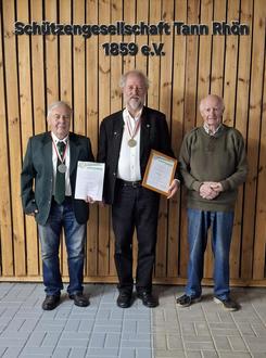 In dem Wettbewerb Kleinkaliber Auflage 100 m, 30 Schuss konnten unter wiedrigen Wetterbedingungen die Schützen Alfred Mihm (links) mit 30 Zehner 314,4 Zehntelwertung und Roland Richter (mitte) mit 28 Zehner und zwei Neuner 313,9 Zehntelwertung auf die Plätze zwei und drei schießen.
