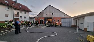 Doch zurück zur Brandbekämpfung: das gut gefüllte Heulager war von Glutnestern unterwandert. Zu Beginn wurden die Bereiche rund um den Durchbrand unter Schaummittelzumischung als Netzmittel (dies nimmt dem Wasser die Oberflächenspannung und es kann somit deutlich besser in die Heulagen eindringen) unter Kontrolle gehalten. Allerdings ließe sich die Gefahrensituation nur mit dem Austragen des eingebrachten Heu nachhaltig in Griff bekommen. Es wurden 4 Traktoren mit Kippanhänger organisiert und das Heu sollte durch zwei Abwürfe auf den sich darunter befindlichen Futtertisch direkt auf die Kippanhänger und von dort auf eine externe Wiese verbracht werden. Die besondere Schwierigkeit lag neben der Heumenge auch an dem durch den Schwelprozess entstandenen Kohlenmonoxid. Dieses ist hochgradig giftig und die Einsatzkräfte galt es hiervor zu schützen, was nur unter umluftunabhängigem Atemschutz (auch bekannt unter schwerem Atemschutz) möglich ist. In einer beispiellosen Aktion starteten wir die Planung in die Praxis umzusetzen. Mit personeller Unterstützung von Atemschutz-Geräteträgern der Feuerwehren Hilders-Simmershausen, Hilders-ELU, Hofbieber-Langenbieber, Hofbieber-Niederbieber, Nüsttal-Gotthards, Motzlar sowie der Stadt Geisa; als zusätzliches Equipment der Abrollcontainer Atemschutz des Landkreises, welcher bei der Feuerwehr Fulda stationiert ist, sowie weiterer umfangreicher Atemschutztechnik der Feuerwehr Hünfeld konnten die grob auf 100 geschätzten Kippanhänger Heu aus dem Heulager auf die Wiese verbracht werden. Die hohen Temperaturen und die körperlich schwere Arbeit unter dem schweren Atemschutz brachte die Geräteträger vielmals an den Rand der Belastbarkeit. Für die Anschlußbetreuung wurden zwei sogenannte PAS-Einheiten mit Unterstützung durch zwei Notärzte und eines Rettungswagens vorgehalten. Diese haben nach den schweren Einsätzen die Vitalfunktionen in den wichtigen Ruhephasen kontrolliert und in einigen wenigen Fällen sogar zusätzlich Sauerstoff verabreicht. Auch in der Technik wurden unglaublich viele Ressourcen benötigt, so wurde unter anderem das gesamte Equipment des AB Atemschutz in Einsatz gebracht. Ausnahmslos jede Atemluftflasche wurde veratmet. Das komplette Heu wurde in dem Zeitraum von etwa 21:30 Uhr bis zum frühen Morgen gegen 06:30 Uhr aus der Scheune ausgeräumt. Hierbei wurde immer wieder das Aufflammen der freigelegten Glutnester direkt abgelöscht. Sieht dies von außen alles recht unspektakulär aus war dies jedoch eine Meisterleistung der eingesetzten Feuerwehrkräfte. Es entstand durch dieses zielgerichtete Vorgehen praktisch keinerlei Schaden an dem Gebäude.