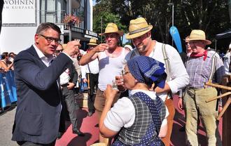 Nach vier Stunden und einigem Durcheinander aufgrund der Übertragungsschwierigkeiten des Hessischen Rundfunks kamen wir endlich vor der Ehrentribüne an und wurden tatsächlich bereits vom Ministerpräsidenten erwartet. Boris Rhein stellte sein handwerkliches Geschick unter Beweis und baute mit Unterstützung der Trachtengruppe und Bürgermeister Matthias Gelbe in Windeseile ein Wagenrad auf. Die hölzernen Speichen mussten mit einem Holzhammer in eine Wagennabe geschlagen werden. Zur Belohnung gab es einen Hollerblütenschnaps aus dem von Albrecht Spiegel geliehenen Spezial-Holzklotz.