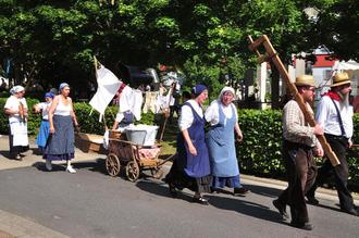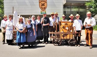 Die Zugnummer 112 der Trachtengruppe Tann (Rhön) stand unter dem Motto „Alltag in der Rhön im 19. Jahrhundert“. Die 14 Teilnehmer stellten den Beruf des Stellmachers dar und zeigten, wie mühsam damals Wäsche gewaschen wurde.