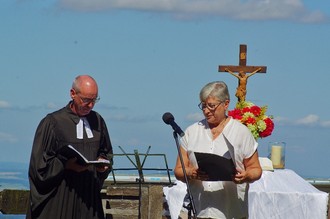 Am 11.August hat die Kirchengemeinde Tann auf der Grenze zwischen Thüringen und Hessen einen besonderen Gottesdienst gefeiert. Mit dem Planwagen, in der „Pilgergruppe“ bzw. auf eigene Faust kamen die Menschen zur „Kanzel“. Ein Aussichtspunkt, den viele Wanderer und Spaziergänger besuchen, um eine Rast zu machen und die Landschaft zu genießen.