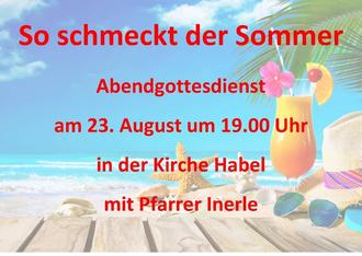 Sommer, Sonne Strand oder Arbeit auf dem Feld, Sonnenbaden am Strand oder Schwitzen im Büro und auf der Baustelle. Der Sommer ist für die einen Urlaubszeit und für die anderen eine Zeit der vielen Arbeit. Alle von uns haben ihre Erfahrungen und Erinnerungen an vergangene Sommer und das alles prägt unser Gefühl in diesen Tagen. Dazu wollen wir einen Abendgottesdienst in der Kirche Habel feiern.