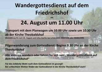 In diesem Jahr findet der Wandergottesdienst in unserer Kirchengemeinde am 24. August um 11:00 Uhr auf dem Friedrichshof statt.