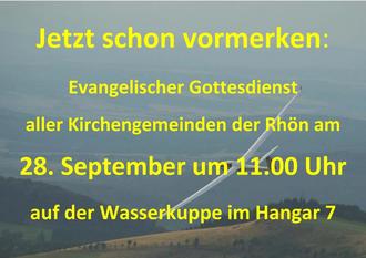 Auch in diesem Jahr findet wieder der Gottesdienst der Rhöner Gemeinden auf der Wasserkuppe statt. Er wird von den evangelischen Pfarrerinnen und Pfarrern der Kirchengemeinden der Region gehalten. Wie immer findet er um 11:00 Uhr statt und es dreht sich in diesem Gottesdienst um Gott und die Welt, um Abheben im Glauben und Ankommen bei Gott.