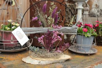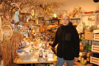 Julia Grob: Ich fertige vor allem Geschenkartikel aus Draht. Typisch sind meine Deko-Ringe, die ich mit Blättern und Trockenblumen verziere. Diese gibt es als Wandschmuck und zum Hinstellen, nicht nur rund, sondern auch in Herz- oder Hausform. Das Sortiment passe ich an die Jahreszeiten an, aber die Farbe Rosa ist das ganze Jahr hindurch der Renner.