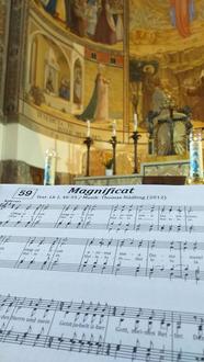 Dabei gelang es ihm, auch musikalische Brücken zu schlagen, zum Beispiel zu den Flötentönen der Hirten von Bethlehem, zur Wirkung des Singens auf die Glaubenden, zum Lobpreis mit Maria (Magnificat) sowie zu den brennenden Herzen und erleuchteten Augen der Emmaus-Jünger mit der Antwort „Halleluja“ als Spiegel der Pilgerreise.