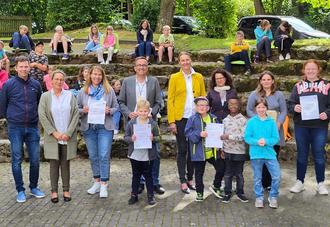 Dem schlossen sich auch die zuständige Schulamtsdezernentin Frau Kurth-Gesing und die beiden Fachberater des Staatlichen Schulamtes Sabine Mielke und Philipp Schleipen an, die die Teilzertifikate „Lehrkräftegesundheit“ sowie „Verkehr und Mobilität“, „Bewegung und Wahrnehmung“, „Ernährung und Konsum“ und „Sucht- und Gewaltprävention“ übergaben. Zudem wurde stellvertretend für die Ehrung als „Gesundheitsfördernde Schule“ eine Medaille für die besonderen Leistungen der Schule verliehen: „Bei den verschiedenen Treffen und Gesprächen und bei der Durchsicht der Unterlagen ist deutlich geworden, dass „Schule und Gesundheit“ an der gesamten Schule nicht nur dokumentiert und evaluiert, sondern durchgehend gelebt wird.“