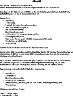 Sollte sich kein neuer Vorstand finden bzw gewählt werden, lädt der Vorstand im Anschluss der Wahlversammlung zu einer außerordentlichen Mitgliederversammlung ein, um einen entsprechenden Beschluss der Mitglieder zwecks Auflösung der RK Tann zu fassen!