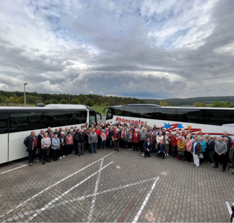 Im Anschluss daran ging es nach Obererthal wo wir alle gemeinsam ein leckeres Mittagessen einnehmen konnten. Frisch gestärkt fuhren wir dann mit unseren Bussen und zugestiegenen Führern rund um Hammelburg. Herrliche Aussichtspunkte offenbarten hierbei bei bestem Wetter wunderbare Blicke auf die Landschaft Unterfrankens sowie die Weinberge. Auf der Rückkehr nach Hause legten wir noch einen Zwischenstop in Oberthulba ein. Bei Kaffee und Kuchen sowie guten Gesprächen konnten alle nochmal den Tag Revue passieren lassen und die letzten Sonnenstrahlen genießen.