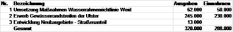 Die Finanzierung soll über die Haushaltsstellen im Bereich 5521 Öffentliche Gewässer und 5411 Gemeindestraßen erfolgen. Folgende Mittel aus den Haushalten 2022/2023 sollen umgewidmet werden und würden dann im HH-Plan 2024 wieder angesetzt werden.