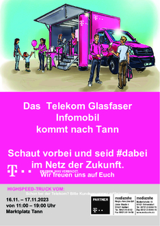 Die Deutsche Telekom wird vom 16.11.2023 - 17.11.2023 in der Zeit von 11:00 Uhr - 19:00 Uhr mit einem Infotruck vor dem Tanner Marktplatz sein. Dort werden die Mitarbeiterinnen und Mitarbeiter für Fragen und Informationen zur Verfügung stehen. Lassen Sie sich gerne beraten und über den individuellen Ausbau in ihrem Stadtteil beraten.