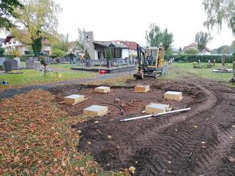 Auch mit den Gründungsarbeiten der Dacherweiterung und des Pavillons wurde begonnen und die ersten Fundamente sind schon fertiggestellt. In den kommenden Wochen wird das Gerüst, um die Leichenhalle aufgestellt und danach erfolgen die Dacharbeiten an der Friedhofskapelle.