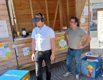 Der Tanner Bürgermeister Mario Dänner beim Ausprobieren einer VR-Brille mit Michael Werthmüller, Weiterbildungslehrer der VHS. Foto: Susanne Stumpf