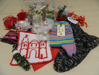 Zahlreiche handgestrickte Strümpfe in vielen Größen und Farben, Filzschuhe, Taschen, Topflappen, unsere beliebten kleinen Engel und vieles mehr stehen dort preisgünstig zum Verkauf.