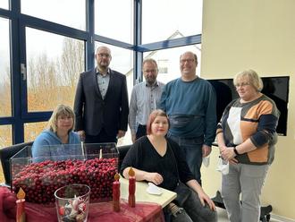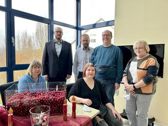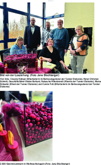 Bild von der Losziehung: (Foto Jana Blochberger) Von links: Claudia Kümpel (Mitarbeiterin im Betreuungsdienst der Tanner Diakonie), Notar Christian Schmitt, Geschäftsführer Stefan Burkard, Natascha Hillenbrandt (Klientin der Tanner Diakonie), Marcel Schaefer (Klient der Tanner Diakonie) und Carola Fuß (Mitarbeiterin im Betreuungsdienst der Tanner Diakonie)