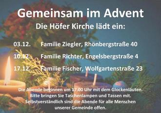 Auch in diesem Jahr laden Menschen in Theobaldshof und Knottenhof wieder zu „Gemeinsam im Advent“ ein. Die Abende finden jeweils mittwochs um 17.00 Uhr statt.