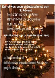 | Geschichten und Texte zum Advent. Musik und Gesang: Ramona Rottmann und LeaGrunenberg. Im Anschluss traditioneller Glühweinmarkt auf dem Platz neben der Kirche |