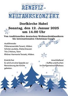 Das Benefiz Neujahrskonzert findet in Habel am 12. Januar um 14.00 Uhr in der Kirche statt. Anschließend ist die Gemeinde zu einem gemütlichen Zusammensein in das Schützenhaus eingeladen.