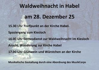 | So treffen wir uns um 15.30 Uhr bei der Kirche in Habel und laufen zum Kiesloch. Wer für sich dorthin wandern möchte, der kann dies tun. Um 16.00 Uhr feiern wir im Kiesloch eine Andacht bei Fackellicht und einem geschmückten Weihnachtsbaum und der Krippe. Anschließend wandern wir in Etappen zur Kirche (Habel), hören unterwegs weihnachtliche Texte und singen die bekannten Lieder. An der Kirche werden wir dann um 17.00 Uhr von Glühwein und Würstchen empfangen. |