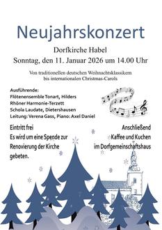 Das Benefiz Neujahrskonzert findet in Habel am Sonntag, 11. Januar 2026 um 14.00 Uhr in der Kirche statt. Anschließend ist die Gemeinde zu einem gemütlichen Zusammensein eingeladen.
