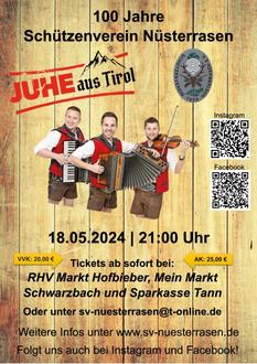 Zu unserem 100-jährigen Jubiläum bieten wir dieses Jahr etwas Besonders. Die Tiroler Kapelle JUHE ist bekannt aus Funk und Fernsehen und war bereits im vergangenen Jahr mehrfach in der Rhön zu hören.