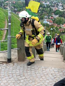 Noch am gleichen Tag ging es weiter nach Radebeul, wo am Sonntag der nächste Treppenlauf stattfand. Hier handelt es sich um einen Staffellauf der Feuerwehr, die sich dem Mount-Everest-Lauf angeschlossen hat. Das heiÃt, die Feuerwehrteilnehmer starten direkt nacheinander, sodass die Feuerwehr einen Staffellauf über 24 Stunden absolviert. Der Lauf findet in den Weinbergen in Radebeul auf der Spitzhaustreppe statt und es müssen ca. 300 Meter sowie 397 Stufen erst hinunter und dann wieder hinauf absolviert werden. Kay Hain hat den Anfang gemacht und konnte mit 12:22 Minuten den Lauf abschlieÃen. Karsten Neupert folgte mit 11:21 Minuten und Martin Kunze mit 14:29. Jana hat das Ziel nach 13:22 Minuten überquert und es auf Platz 3 geschafft.