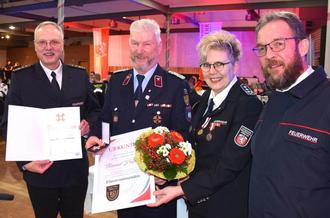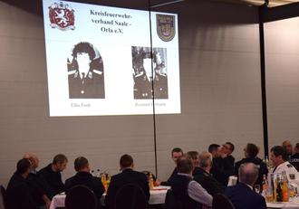 Karsten Utterodt, Vorsitzender des Thüringer Landesfeuerwehrbands, ehrte Reimund Hofmann, den seit 50 Jahren in der Feuerwehr aktiven Gründungsvorsitzenden des Kreisverbandes mit dem Goldenen Brandschutzabzeichen. Die Kreisverbandsvorsitzende Ina Papmeyer-Wohlfarth und deren Stellvertreter Frank Hermann ernannten Hofmann zum Ehrenvorsitzenden des Kreisfeuerwehrverbandes.