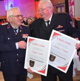 Ehrenurkunden mit dem Titel „Ehrenkassenprüfer“ erhielten die Kameraden Andreas Schmidt und Ralph Ehrlich, als Ehrenmitglieder wurden die ehemaligen Landräte Frank Roßner und Thomas Fügmann geehrt.