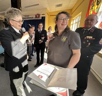Die tüchtige Feuerwehr-Vereinsvorsitzende Michaela Storch (Mitte) wurde durch Ina Papmeyer-Wohlfarth (l.) mit der Ehrennadel des Thüringer Feuerwehrverbandes ausgezeichnet.