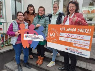 KiTa-Beirat und Leitung waren sich einig aus dem Erlös der 2023er Martinsaktion 1000 Euro dem Verein „Hilfe für krebskranke Kinder Frankfurt e.V.“ zu spenden. Wer die Homepage www.kinderkrebs-frankfurt.de im Internet sucht, vermutet vielleicht totale Hoffnungslosigkeit und Traurigkeit angesichts der Tatsache, dass man selbst in eine solche Gefühlslage kommen kann, wenn das eigene Kind erkranken würde oder einem nur der Gedanke in den Sinn kommt. Aber wenn man die Homepage des Vereins aufruft, wird einem das Gegenteilige klar: Das Ziel und die Vision des besonderen Vereins lautet: „Jedes an Krebs erkrankte Kind wird gesund und hat die Chance auf eine Zukunft ohne Spätfolgen!“ Deswegen konzentriert sich der Verein auf drei Stärken: Helfen, Heilen und Forschen! Damit verfolgen sie ein Ziel: Krebs bei Kindern zu besiegen. Gemeinsam mit der Uni-Klinik Frankfurt kümmert sich der Verein um krebskranke Kinder und ihre Familien. Sie verbessern die Lebensumstände, unterstützen die medizinische Versorgung und ermöglichen noch mehr Forschung. Besser kann man es nicht sagen: Das treibt uns an. Jeden Tag! so steht es auf der Homepage!