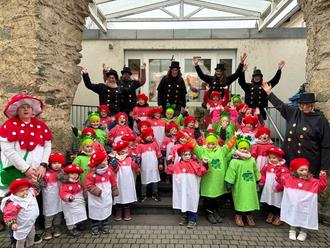 Fliegenpilze, Kleeblätter und sogar Schornsteinfeger stürmten am Freitag vor Fasching den Brunnenplatz. Begleitet von Mamas, Papas, Geschwistern, Omas und Opas ging es pünktlich um 12 vor 12 in einer Polonaise vom Kindergarten St. Agatha zum Brunnenplatz. Dort führten die Kinder gemeinsam mit den ErzieherInnen in ihren selbst gestalteten Kostümen zwei einstudierte Tänze auf. Kitakoordinatorin Anna Stecker und Bürgermeistern Alicia Bokler ließen es sich nicht nehmen, sich den Auftritt anzuschauen und hatten im Anschluss eine süße Überraschung für die Kinder dabei. Dafür wurden den beiden selbstgebastelte Faschingsorden überreicht.